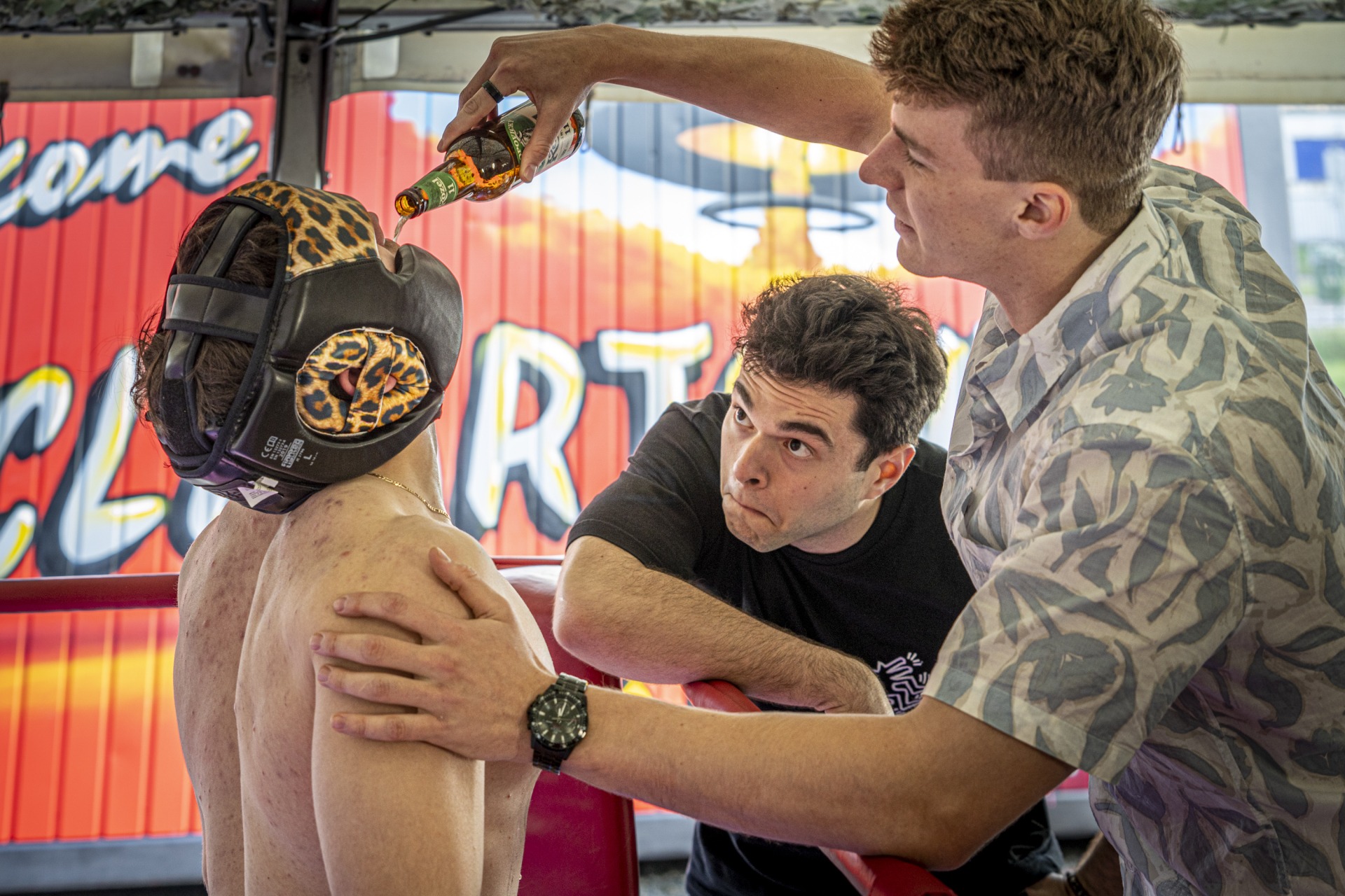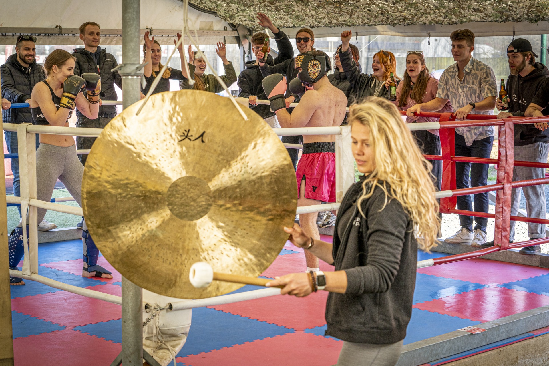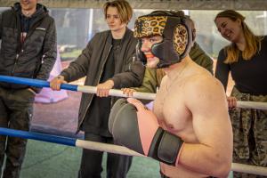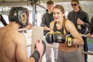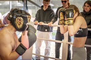 The session starts with a short safety briefing. Then the brave volunteer suits up, puts on gloves, and steps into the ring. His mission? Survive the round without giving in to the girl’s punches – easier said than done!